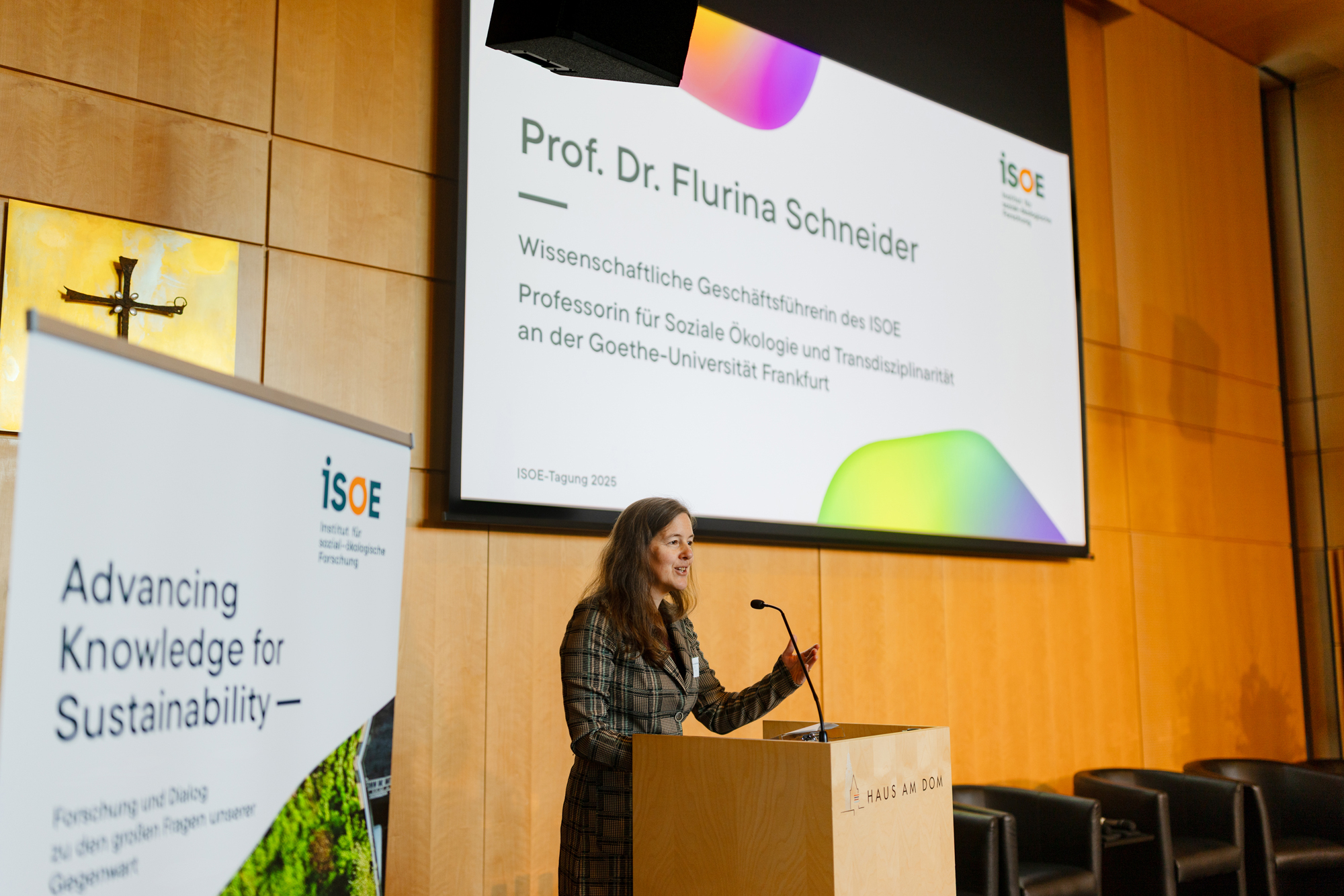 Man kennt das vom Radfahren: Bietet man Gegenwind nicht die Stirn, bleibt das Ziel unerreichbar. Das Institut für sozial-ökologische Forschung (ISOE) hat den Gegenwind als Metapher für seine Tagung genutzt und auf gesellschaftspolitische Entwicklungen übertragen. Denn der sozial-ökologischen Nachhaltigkeitsforschung weht derzeit ein kalter Wind entgegen. Das bekommen Forschende genauso zu spüren wie Akteure aus Unternehmen, Verbänden, Verwaltung, Politik und Zivilgesellschaft, die sich für Nachhaltigkeit einsetzen. Wie also weiter? Mehr als 150 Gäste haben darüber bei der ISOE-Tagung am 26. November 2025 in Frankfurter Haus am Dom diskutiert.