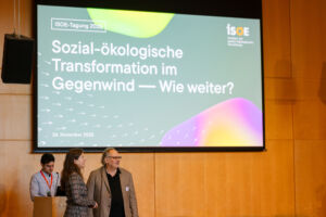 Einfache Antworten auf diese Fragen gibt es nicht. Beispiele umso mehr. In ihrer Begrüßungsrede nannte Flurina Schneider, Wissenschaftliche Geschäftsführerin des ISOE, die Verhandlungen bei der COP30. Sie waren kurz vor der ISOE-Tagung ohne nennenswerte Ergebnisse beendet worden, ohne Signalwirkung für den notwendigen Ausstieg aus den fossilen Energien. Transformationsforscherin Flurina Schneider machte in ihrer Rede deutlich, dass dies einer Dynamik entspreche, die sich länger schon in der Nachhaltigkeitspolitik abzeichne und von rechtspopulistischen Strömungen benutzt werde: