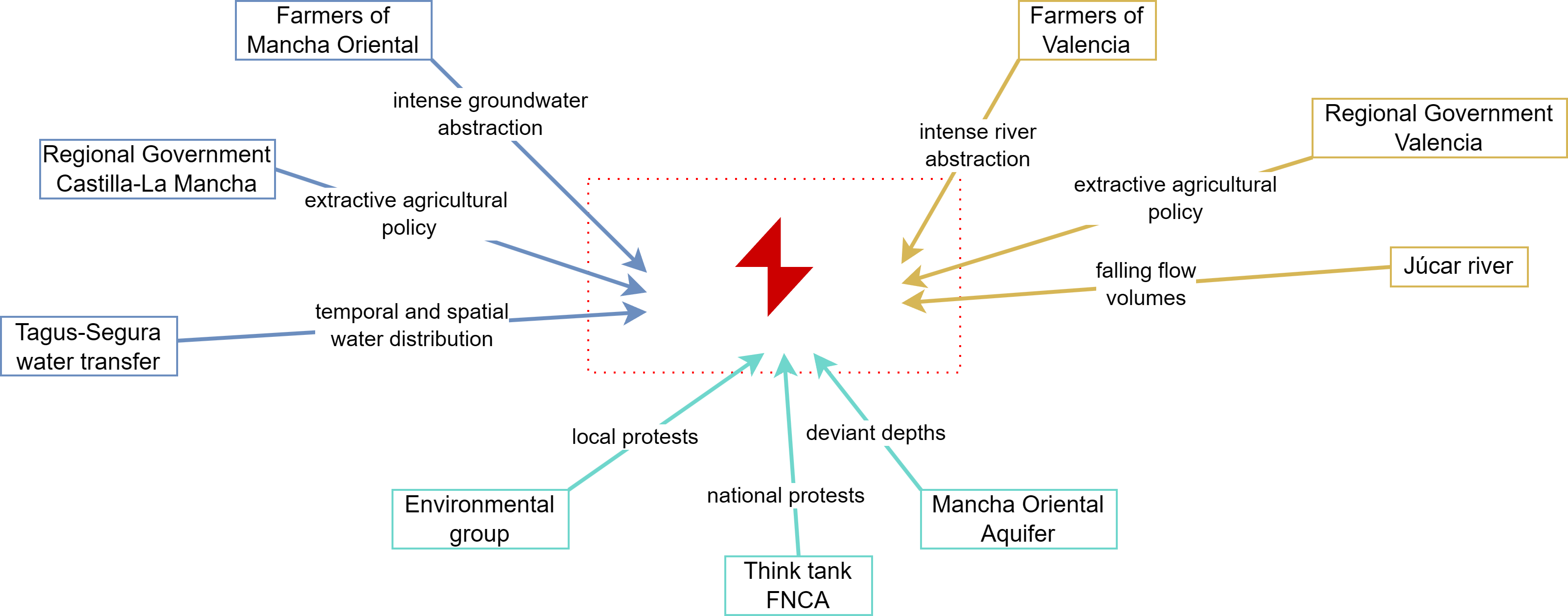 Das Einzugsgebiet des Flusses Júcar liegt im Südosten Spaniens. Es umfasst große Teile der autonomen Gemeinschaften Valencia und Kastilien-La Mancha. Während die Landwirt*innen in Valencia das Wasser des Júcar bereits seit Jahrhunderten nutzen, entwickelte sich die großflächige Bewässerungslandwirtschaft in La Mancha erst in den 1970er Jahren. Dafür nutzen Landwirt*innen den riesigen Grundwasserleiter Mancha Oriental. Dieser Grundwasserleiter speist jedoch auch den Fluss Júcar, der in Richtung Valencia fließt. Die anthropozentrische Umweltkonfliktforschung analysierte diesen Konflikt bislang als Konkurrenz um Wasserressourcen zwischen Landwirt*innen aus La Mancha (Oberlieger) und denen aus Valencia (Unterlieger). Eine sozial-ökologische Konfliktperspektive hebt hingegen die entscheidenden und vielfältigen Rollen hervor, die nicht-menschliche Akteure in diesem Konflikt spielen. Die folgende Abbildung zeigt die menschlichen und anders-als-menschlichen Konfliktparteien, ihre Wirkungen aufeinander und die daraus entstehenden sozial-ökologischen Koalitionen im Wasserkonflikt im Einzugsgebiet des Júcar in Spanien.
